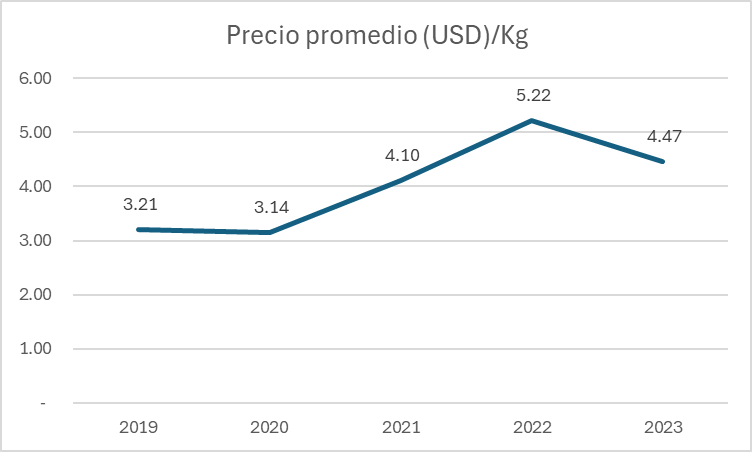 La calidad del café peruano no solo se refleja en sus cifras de exportación, sino también en su precio promedio. En 2019, el precio por kilogramo fue de 3.21 USD, y en los siguientes años, este valor fue incrementando, hasta alcanzar su punto máximo en 2022 con 5.22 USD/kg. Este incremento refleja tanto la alta calidad del producto como su apreciación en el mercado global. Aunque en 2023 el precio se ajustó a 4.47 USD/kg, sigue siendo superior al valor promedio de años anteriores.